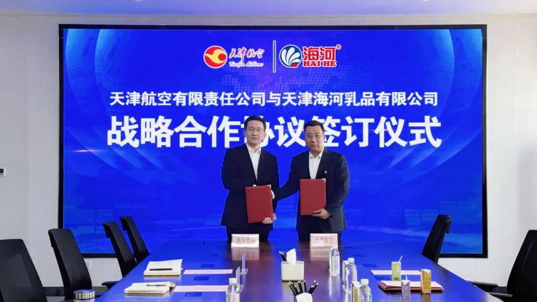 3月5日,天津航空有限责任公司(以下简称“天津航空公司”)与天津海河乳品有限公司(以下简称“海河乳品公司”)签署战略合作协议,双方正式确立长期伙伴关系。天津航空公司党委书记王煜、工会办公室主任李子毓、市场销售部用户运营中心经理由阳、客舱服务部客舱供应管理中心业务主管马钊等,海河乳品公司党委主要负责人、分管领导及相关部门负责人出席签约仪式。此次战略合作标志着海河乳品公司正式成为天航餐食供应商,海河牛奶也将伴随天航航班飞向全国,与旅客在“云端”相遇,传递“海河品牌”的匠心与温度。合作的达成不仅是两家企业的共赢之举,更彰显了天津本土企业主动融入新发展格局的责任担当。在天津市“制造业高质量发展行动”和“品质生活创造行动”的引领下,天津航空与海河乳品以创新为纽带,将“老字号”的匠心精神与现代化服务业态深度融合,为天津实体经济提质升级注入新动能,也为京津冀协同发展战略写下生动注脚。未来,双方也将围绕航空餐食供应、定制化产品研发、品牌联合推广等方面进一步为旅客提供更具地域文化特色的高品质服务体验,致力于共同构建“航空+乳业”融合发展的创新业态,让旅客在享受美食的同时,也能感受到哏儿都特色文化。这份“云端上的天津味道”将成为传递城市魅力、服务民生需求的一张亮丽名片。