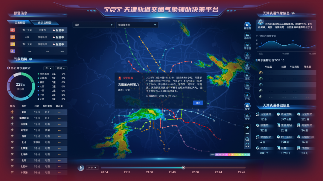 今冬初雪将至,极端天气对城市交通运营的考验日益临近。12月11日,“天津轨道交通气象辅助决策平台”正式上线“冻雨智能预测”功能,标志着天津轨道交通冬季防寒抗冻工作彻底告别“被动应对”,全面迈入“事前精准干预”新阶段,以科技赋能为市民冬季出行筑牢安全便捷屏障。此次上线的冻雨智能预测模型,由天津轨道交通集团所属线网管理中心组织研发,依托海量历史气象数据迭代分析与实时气象数据动态比对技术,实现了冻雨灾害的精细化、精准化预判。模型可在冻雨发生前6至12小时,输出1×1公里颗粒度的精准预报结果,构建起“预测—告警—决策—复盘”全链条智能服务体系,为轨道交通首班车调度优化、接触网预除冰作业、行车方案动态调整等核心运营环节提供科学决策支撑。对广大市民而言,意味着冬季通勤首班车准点率、线路通行顺畅度得到有力保障,出行规划更具确定性。在强化冻雨智能预测的同时,天津轨道交通已全面完成冬季防雪抗寒应急保障部署,构建起“物资储备足、风险排查细、响应机制顺、队伍保障强”的全方位防控网络,让便民举措贯穿出行全流程。