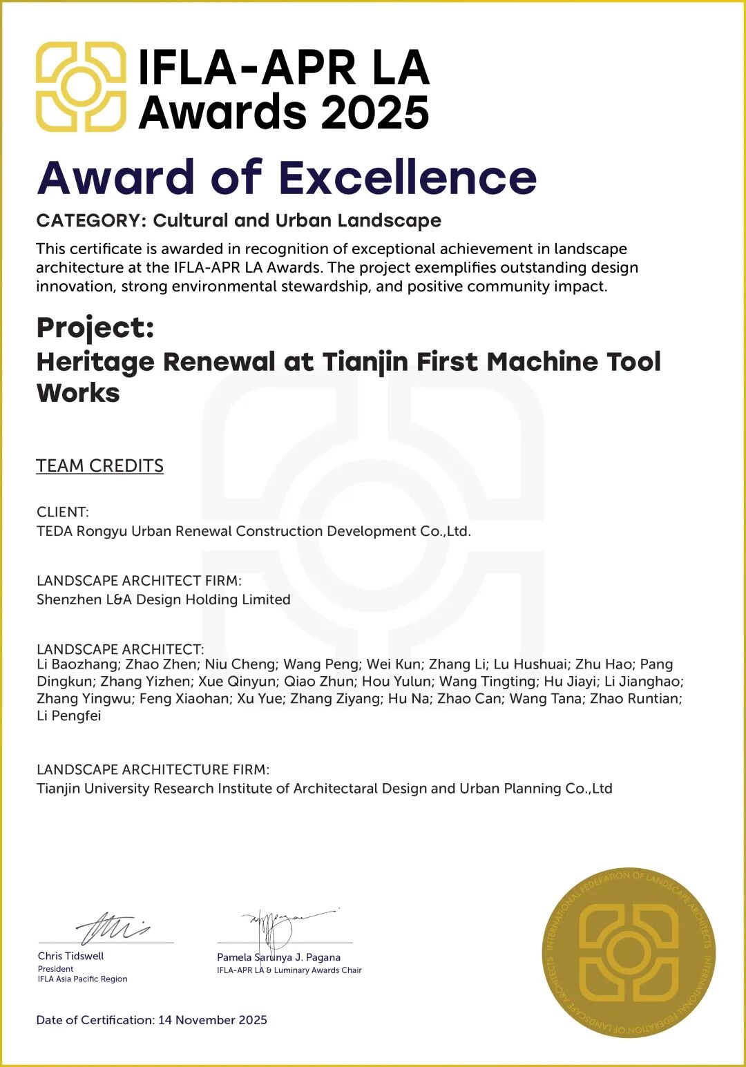 近日,2025年度国际风景园林师协会亚太区风景园林奖(IFLA-APRLA Awards 2025)揭晓,天津泰达控股所属泰达城市更新公司重点打造的津一·PARK项目,凭借文化传承与城市景观营造的卓越实践,荣获“文化与城市景观类卓越奖”,成为中国城市更新实践走向国际的标杆之作。作为泰达城投旗下重点项目,津一·PARK以科学规划为引领,成功实现工业“锈带”变身“秀带”的华丽转型。项目创新采用“片区整体改造+分类保护利用”模式,统筹布局公园绿地、商业服务、居住及市政设施,构建“一核、两带、三轴、四区”的空间格局。通过整合22栋特色建筑及古树资源,对苏联专家楼、车间等工业遗产实施原貌保护与功能再生,在延续城市工业文脉的同时,注入新能源材料、创意设计等新质生产力。在景观修复方面,项目秉持“修旧如故、故里有新”理念,以匠心还原工业建筑细节,加固老旧结构、保护老墙体风貌。同时,将牛腿柱、废弃电线杆等工业遗存转化为景观小品,保留古树名木,并巧妙利用场地高差营造峥嵘台地景观,既化解地形限制难题,又凸显了工业历史痕迹,实现了工业元素与自然景观的有机融合。项目还依托月牙河滨水空间,打造出5万平方米的街区公园,构建全龄友好公共活动场所。此次获奖是国际业界对项目规划设计与景观营造的高度认可。未来,津一·PARK将继续秉持绿色发展理念,深化生态修复与文化赋能,坚持以文化为魂、以生态为基、以民生为本,为工业遗产保护与城市更新提供可复制、可推广的“中国方案”,为天津“设计之都”建设再添亮色。