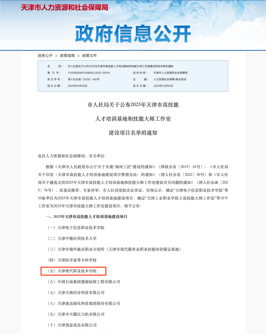 日前,天津市人力资源和社会保障局发布2025年天津市高技能人才培训基地和技能大师工作室建设项目名单,渤轻集团所属天津现代职业技术学院成功获批高技能人才培训基地。培训基地聚焦天津市新兴产业发展需求,围绕网络与信息安全管理员、农产品食品检验员等职业(工种),从培训模式创新、课程体系设计、教材资源开发、师资队伍建设、培训装备配置及能力评价标准等方面,构建起系统完备的高技能人才培训体系,形成规模化培训示范效应。基地建成后,年培训规模将超过1000人次,其中高技能人才培训占比达60%以上。培训项目将重点面向企业职工、退役军人、农村转移劳动力等群体开展技能提升培训,为天津市生物医药、信创产业等新兴产业输送紧缺技术技能人才,助力天津市“1+3+4”现代产业体系建设。此次获批高技能人才培训基地项目,是学院深化产教融合、增强社会服务能力的重要成果,标志着学院在服务区域经济发展、培养高素质技术技能人才方面迈出坚实步伐。下一步,学院将高标准推进基地建设,持续提升人才培养质量和社会服务水平,为天津经济社会高质量发展提供有力的人才支撑。