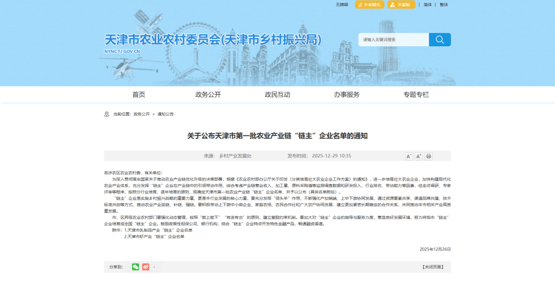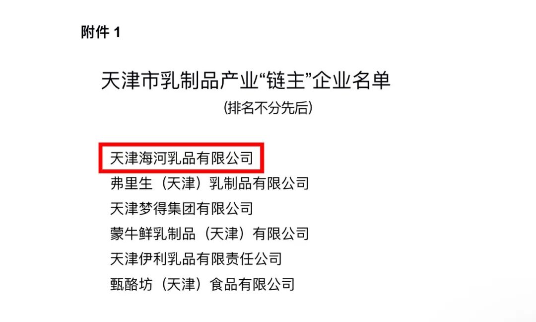 海河乳品公司入选天津市第一批农业产业链“链主”企业