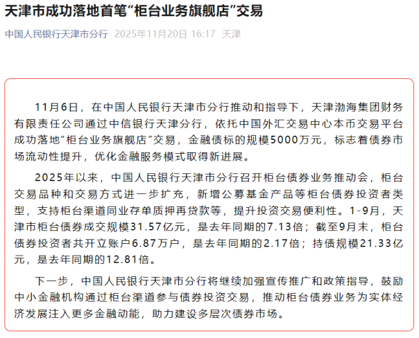 近日,天津渤海集团财务有限责任公司(以下简称“渤海财务”)在中国人民银行天津市分行的指导支持下,通过中信银行天津分行成功落地天津市首笔“柜台业务旗舰店”交易。作为全国首批、天津市首家企业集团财务公司,渤海财务始终坚守“依托集团、服务集团”的功能定位,辅助集团管理归集资金,提升资金运用效率和外部收益水平,充分发挥渤海财务作为集团“金融平台”的专业价值。此次“柜台业务旗舰店”交易的成功落地,是渤海财务深入研究国家多层次债券市场建设政策,结合自身投资策略的具体实践。在央行的政策推动下,柜台债券品类已扩展至银行间市场流通的全部债券类型,柜台债券交易市场已经成为中小金融机构重要债券投资途径,“柜台业务旗舰店”更是该市场发展的最新形式。此次交易,拓宽了渤海财务的投资渠道,也加强了与本地银行金融机构的合作联系。未来,渤海财务将继续跟进政策研究,深入拓展投资渠道和投资品种,持续完善资金运作模式,提升集团资金运作效益,为实体经济发展注入更多金融活水,在建设多层次债券市场的进程中展现国企金融机构的责任与担当。作为投资者参与银行间债券市场柜台债业务的全新模式,为集团资金保值增值开辟新路径,也为天津多层次债券市场建设注入实干动能。