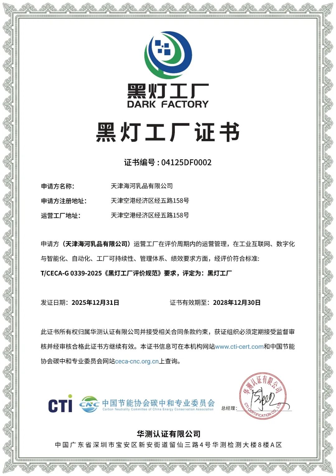 海河乳品公司斩获全国乳企首张“黑灯工厂”证书