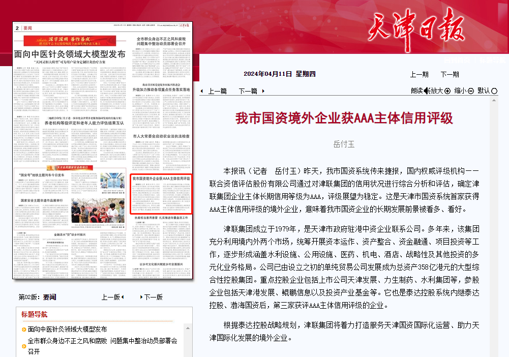 4月11日,我市国资系统传来捷报,国内权威评级机构——联合资信评估股份有限公司通过对津联集团的信用状况进行综合分析和评估,确定津联集团企业主体长期信用等级为AAA,评级展望为稳定。这是天津市国资系统首家获得AAA主体信用评级的境外企业,意味着我市国资企业的长期发展前景被看多、看好。
