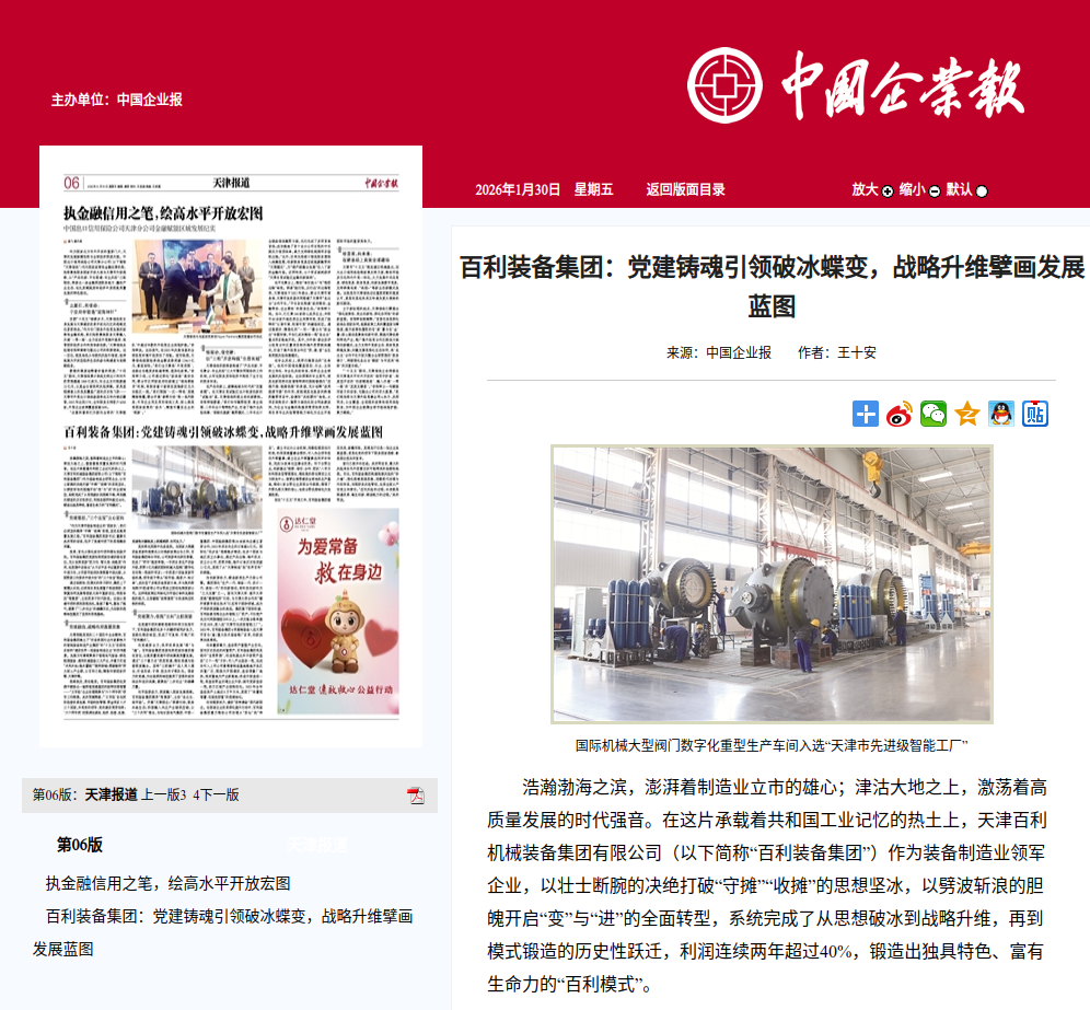 编者按:1月30日,《中国企业报》刊发报道《百利装备集团:党建铸魂引领破冰蝶变,战略升维擘画发展蓝图》,专题报道了百利装备集团充分发挥党委“把方向、管大局、保落实”作用,在实践中总结出“三个法宝”政治秘诀,向党建要合力,向市场要活力,向创新要动力,向存量要潜力,向治理要效力,推动集团高质量发展的生动实践。百利装备集团:党建铸魂引领破冰蝶变,战略升维擘画发展蓝图