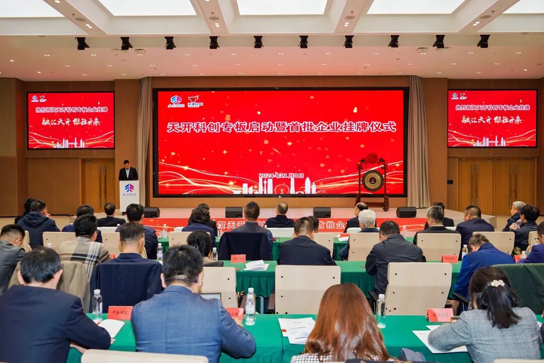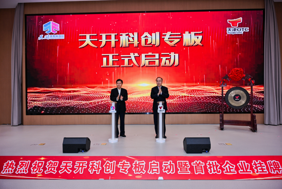 仪式上,市科技局局长朱玉兵、市国资委主任张勇为天开科创专板开板。天津证监局副局长胡经生、市地方金融管理局副局长张建华、天津OTC董事长周华敏登台与培育层企业代表赛迪半导体天津有限公司联合创始人袁强、规范层企业代表数格科技(天津)有限公司总经理年雪山、孵化层企业代表佰鸟纵横科技(天津)有限公司董事长赵宁共同鸣锣,并向三位企业代表颁发证书。
