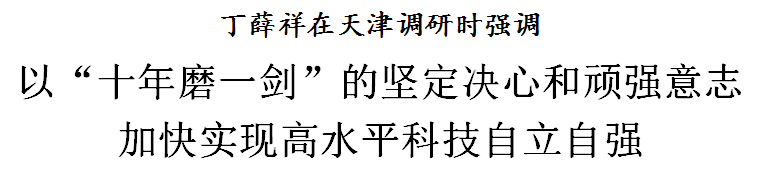 据新华社天津7月4日电 7月3日至4日,中共中央政治局常委、国务院副总理丁薛祥在天津调研。他强调,全国科技大会吹响了建成科技强国的进军号,要深入学习贯彻习近平总书记重要讲话和大会精神,以“十年磨一剑”的坚定决心和顽强意志,加快实现高水平科技自立自强。