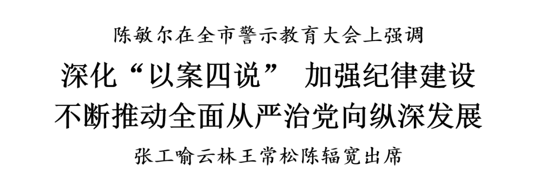 6月11日,全市警示教育大会召开。市委书记陈敏尔主持会议并讲话。他强调,要深入学习贯彻习近平总书记关于党的自我革命的重要思想和全面加强党的纪律建设的重要论述,认真贯彻落实习近平总书记视察天津重要讲话精神,充分发挥警示教育震慑作用,深化以案说德、以案说纪、以案说法、以案说责,扎实开展党纪学习教育,全面加强党的纪律建设,持续净化天津政治生态,不断推动全面从严治党向纵深发展,为奋力谱写中国式现代化天津篇章提供坚强保障。
