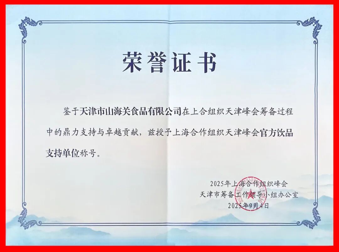 山海关食品荣获“上海合作组织天津峰会官方饮品支持单位”称号