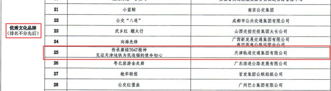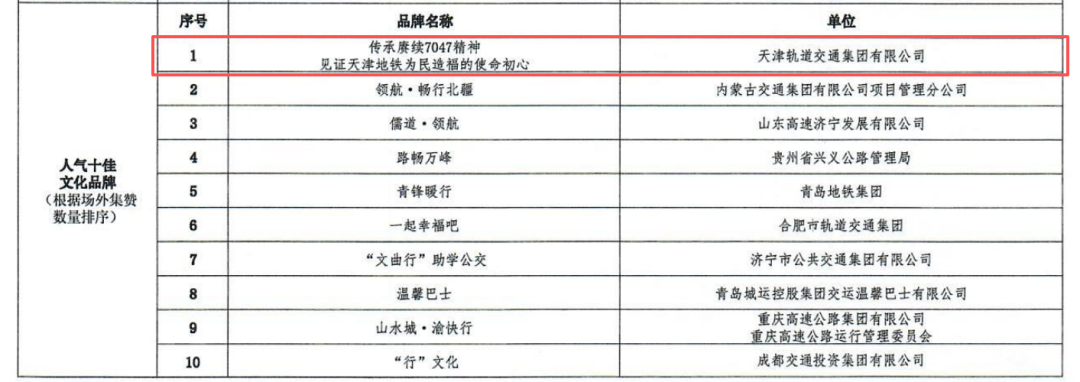12月8日,由中国交通报社主办开展的第七届交通运输优秀文化品牌推选宣传活动结果正式揭晓。天津轨道交通集团《7047文化品牌》同时荣获“人气十佳文化品牌”“优秀文化品牌”,所属地铁集团《品质地铁》荣获“创新力文化品牌”。本次活动吸引了全国铁路、公路、水运、民航、邮政等交通运输各领域的648个品牌参与,历经材料初审、初评、终评、公示等多轮严格筛选,最终评选出各类获奖品牌及优秀组织单位。多年来,天津轨道交通集团深耕以7047精神为根的企业文化,凭借深厚的文化底蕴、创新的服务思路与卓越的行业实绩,通过最终角逐荣获多项殊荣,彰显了天津轨道交通文化品牌的影响力、吸引力。“人气十佳文化品牌”实力圈粉