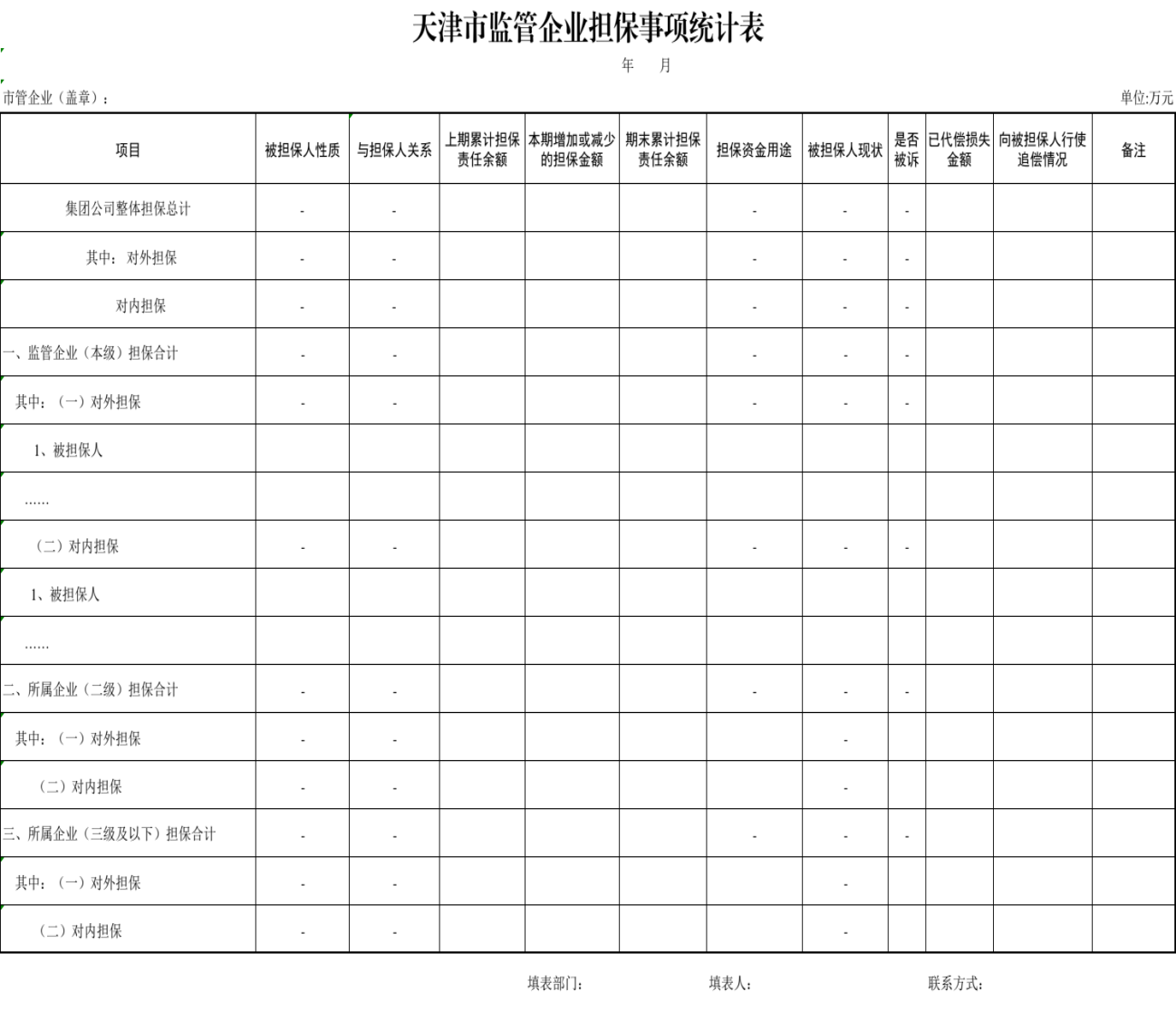 (四)建立担保报告制度。监管企业应统计每月担保变动情况,通过智慧国资平台等方式填列《天津市监管企业担保事项统计表》,并逐月在企业财务月报系统中填列担保事项。